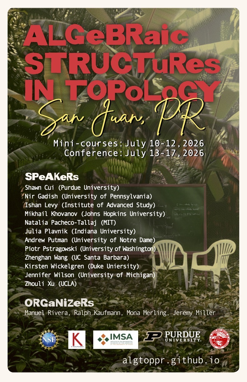 This conference series is organized by Manuel Rivera (Purdue University), Ralph Kaufmann (Purdue University), Mona Merling (UPenn), and Jeremy Miller (Purdue University). The local organizers are Gabriel Montoya Vega (University of Puerto Rico, Río Piedras) and Iván Cardona (University of Puerto Rico, Río Piedras). If you have any questions you may contact the organizers at algtoppr at gmail dot com.
